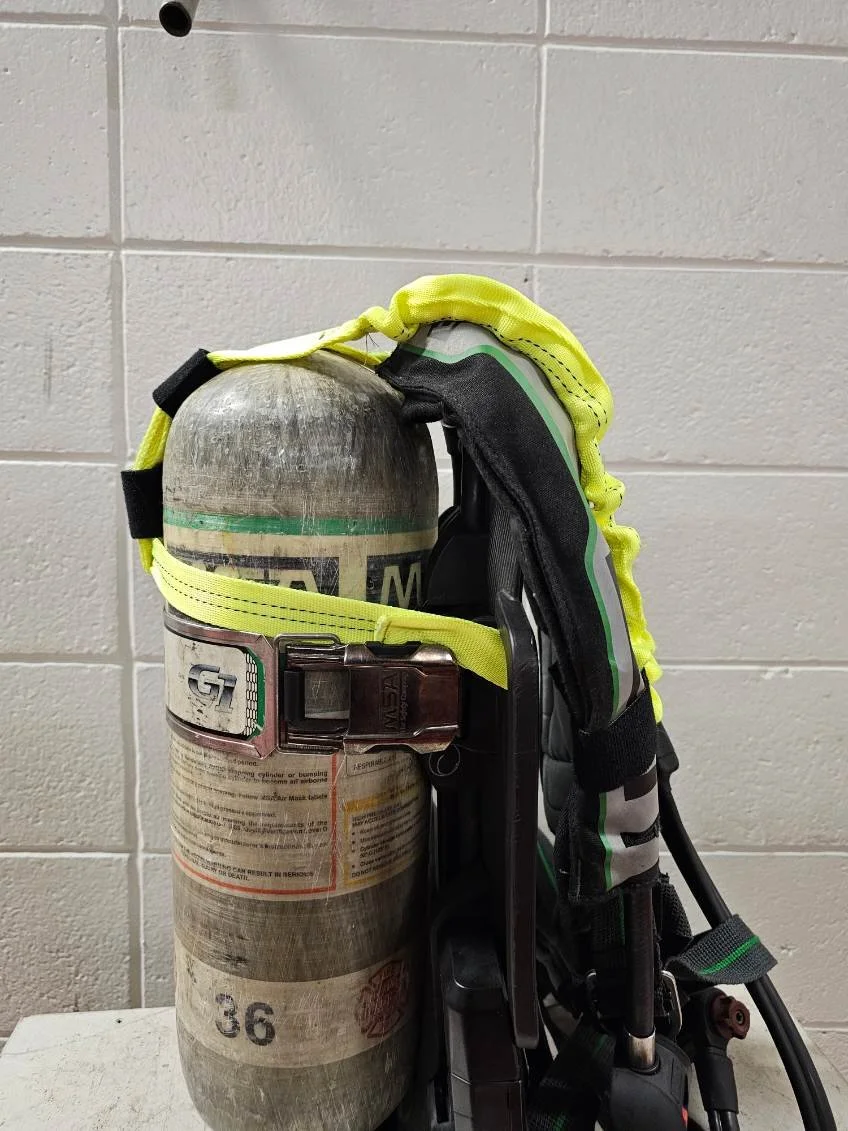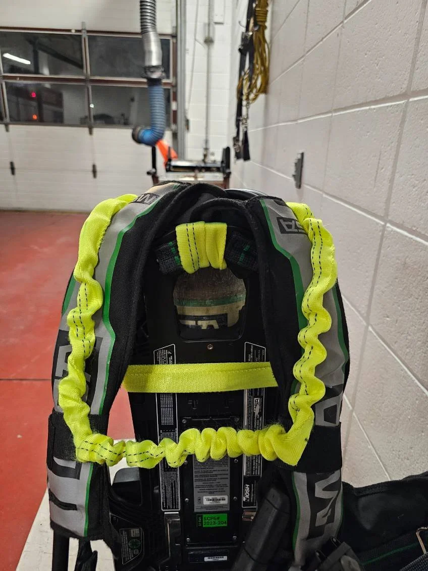 The flexible straps and the semi-flexible loops help deflect the wires. This greatly reduces the time for extrication with the reduction of points where wires can be caught. The SCBA wire entanglement preventer does not interfere with current methods of changing SCBA bottles or other safety devices. It prevents entanglement by attaching to the backplate and to the shoulder straps of the SCBA. This combined with the flexible self-rescue ring prevents wires from sliding between the backplate and the SCBA bottle. At the bottom of the SCBA the wire entanglement preventer extends around the valve assembly which decreases the chances of wires getting entangled in the valve assembly and first stage regulator but still allows access to turn the bottle on and off and bottle removal. It is safe, easy to use, and helps prevent snags and entrapments dangerous to the life of a firefighter.